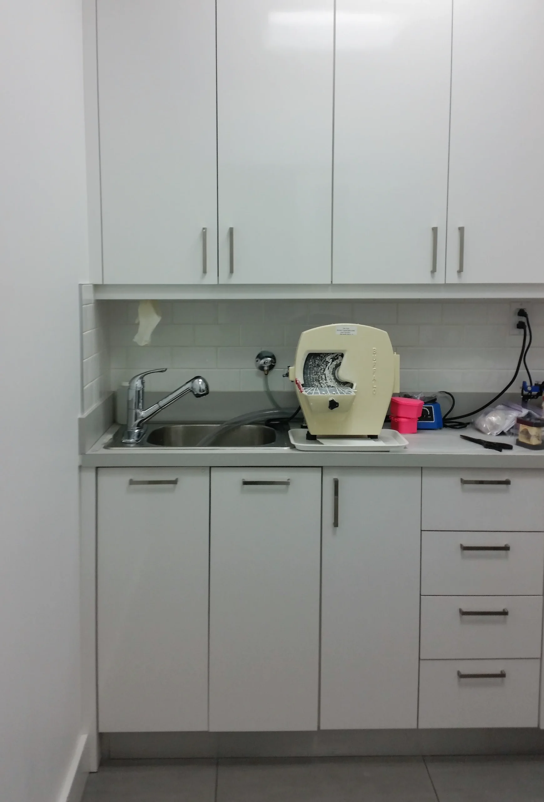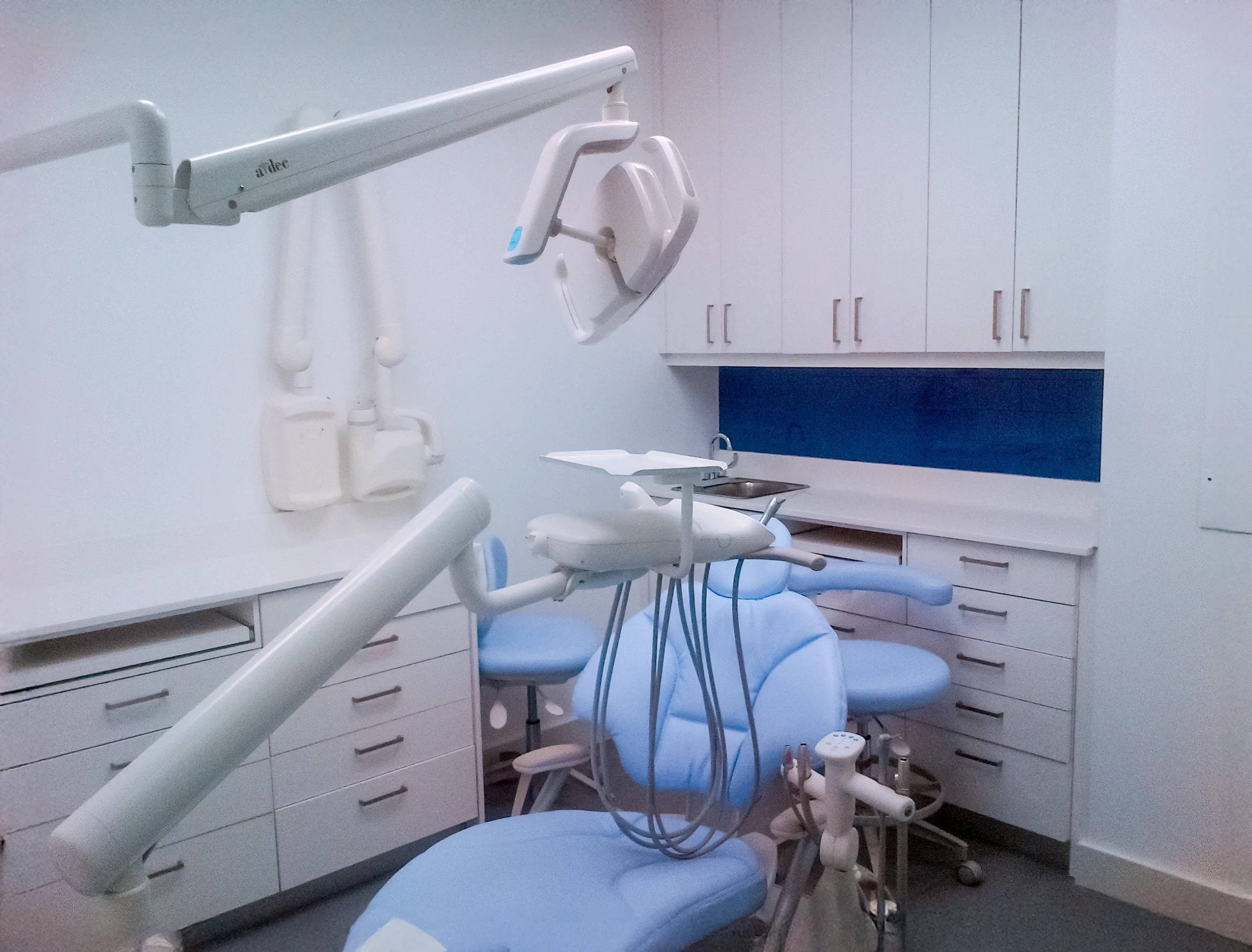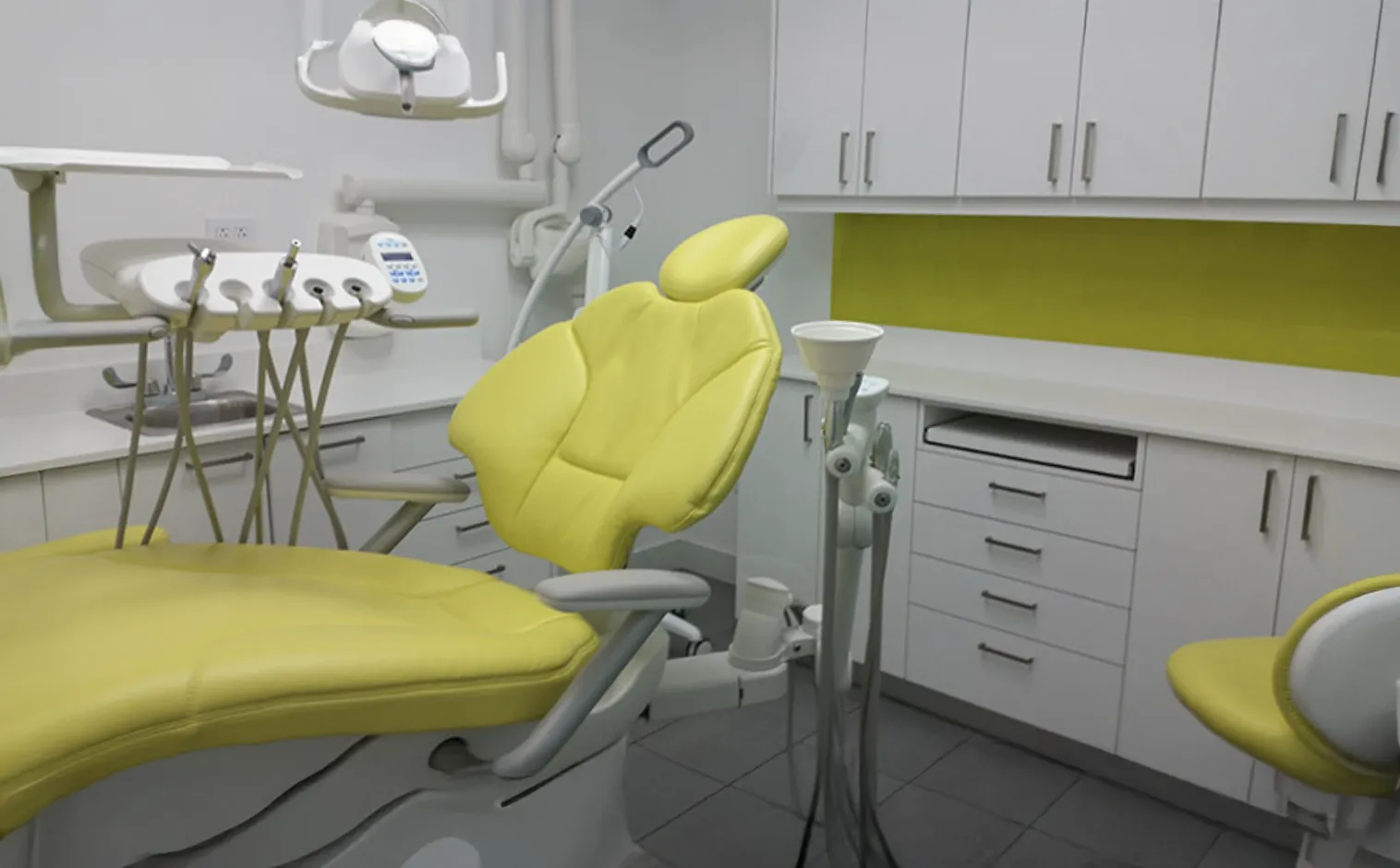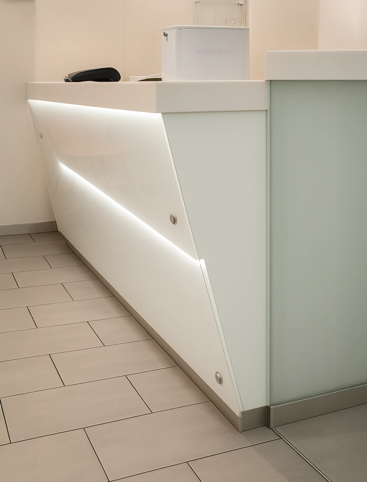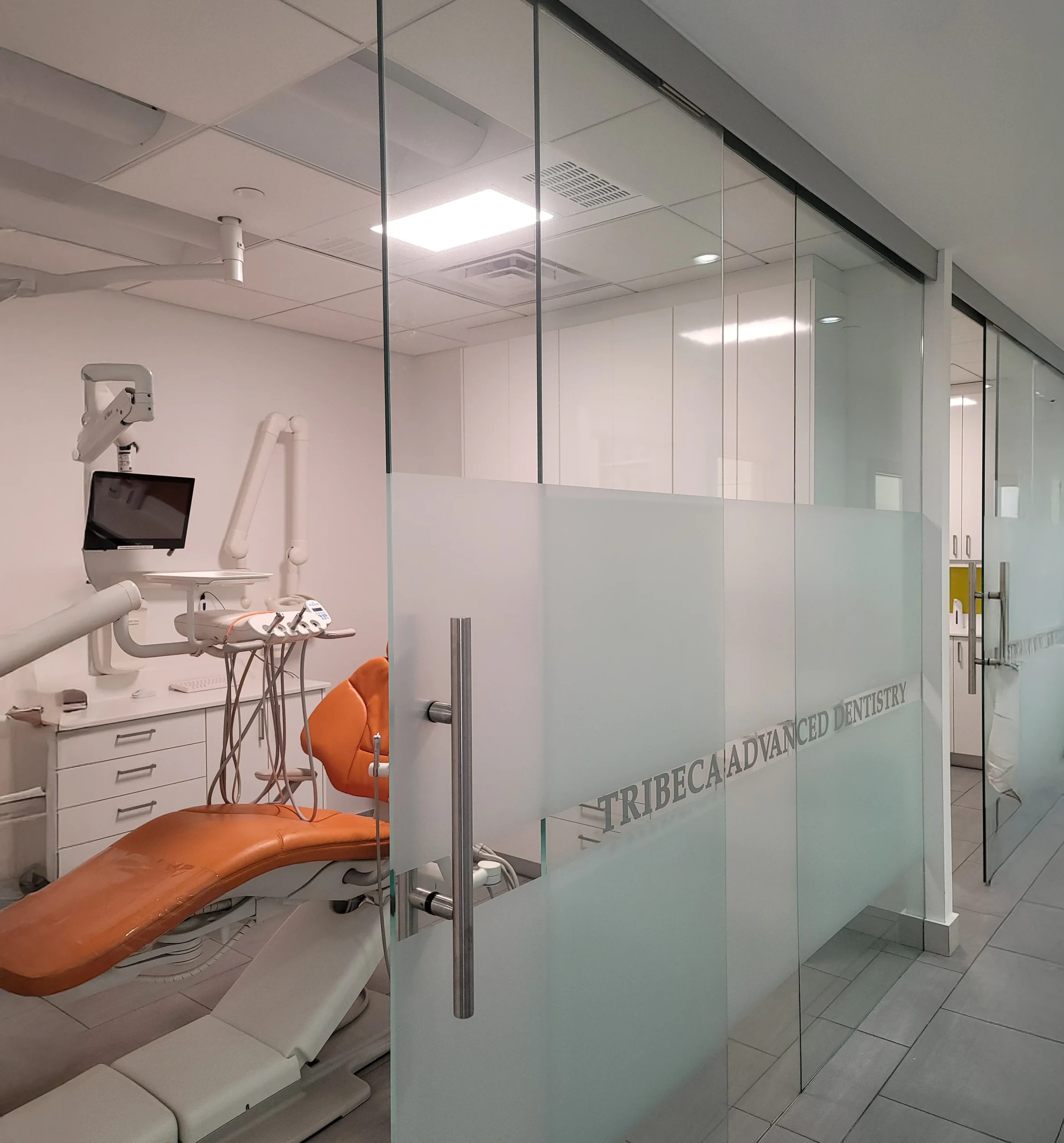 A dental studio in Tribeca, designed with white cabinets, colorful chairs, and a 42-foot glass wall, showcases a sophisticated yet simple design. The combination of white marble and frosted glass reflects the client’s vision and design concept
